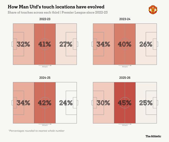将这部分触球作为曼联全场总触球的比例来看,只有30%发生在自家深处防守区域,这一比例显著低于过去三个赛季中的任何一个赛季。
